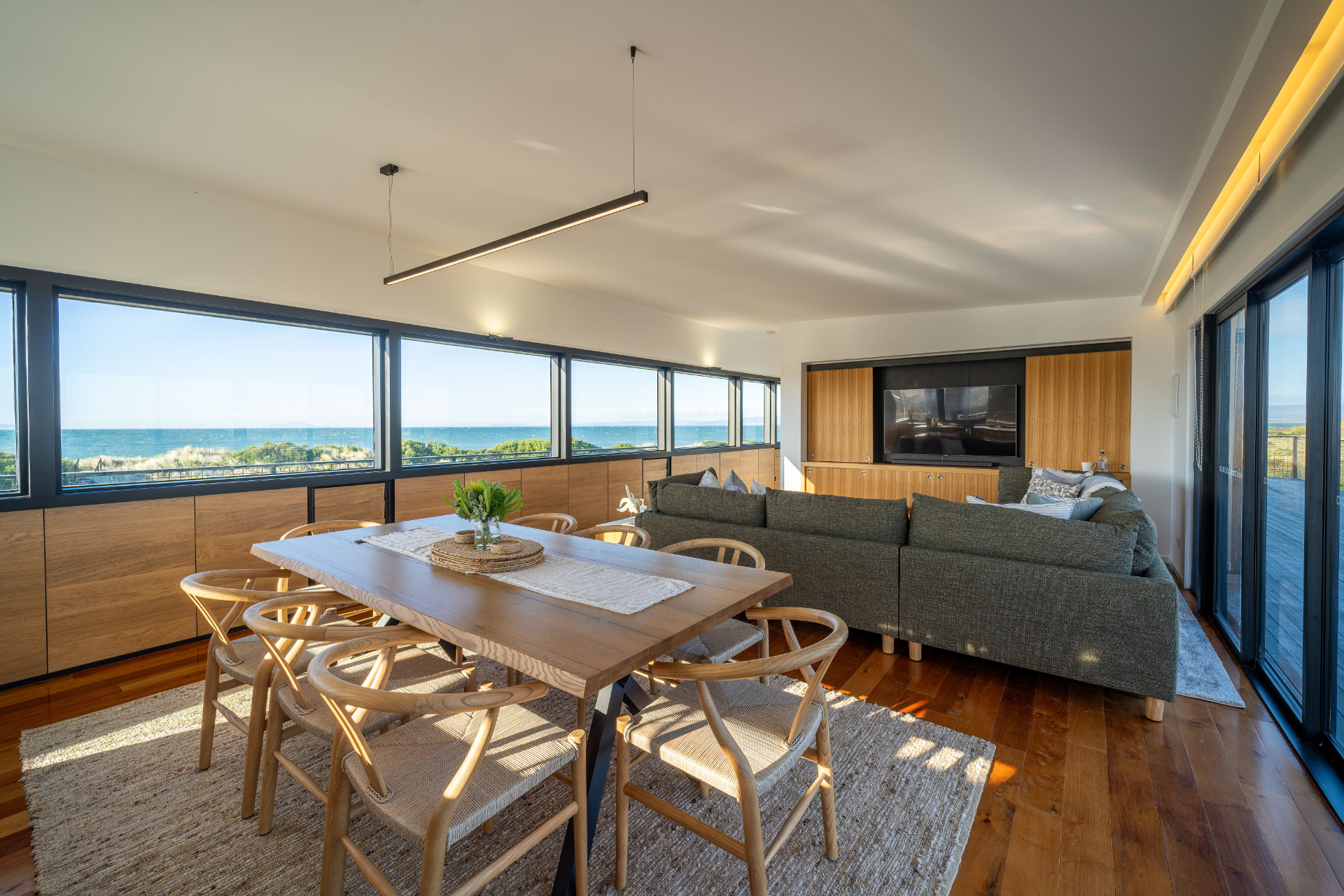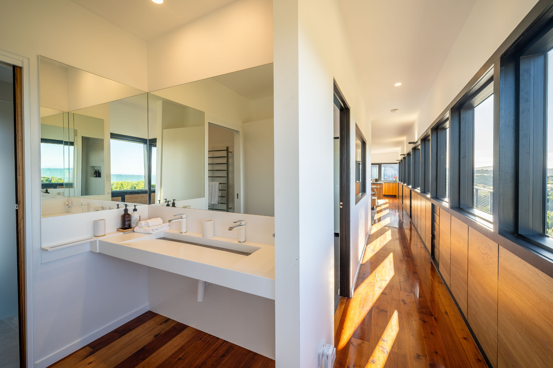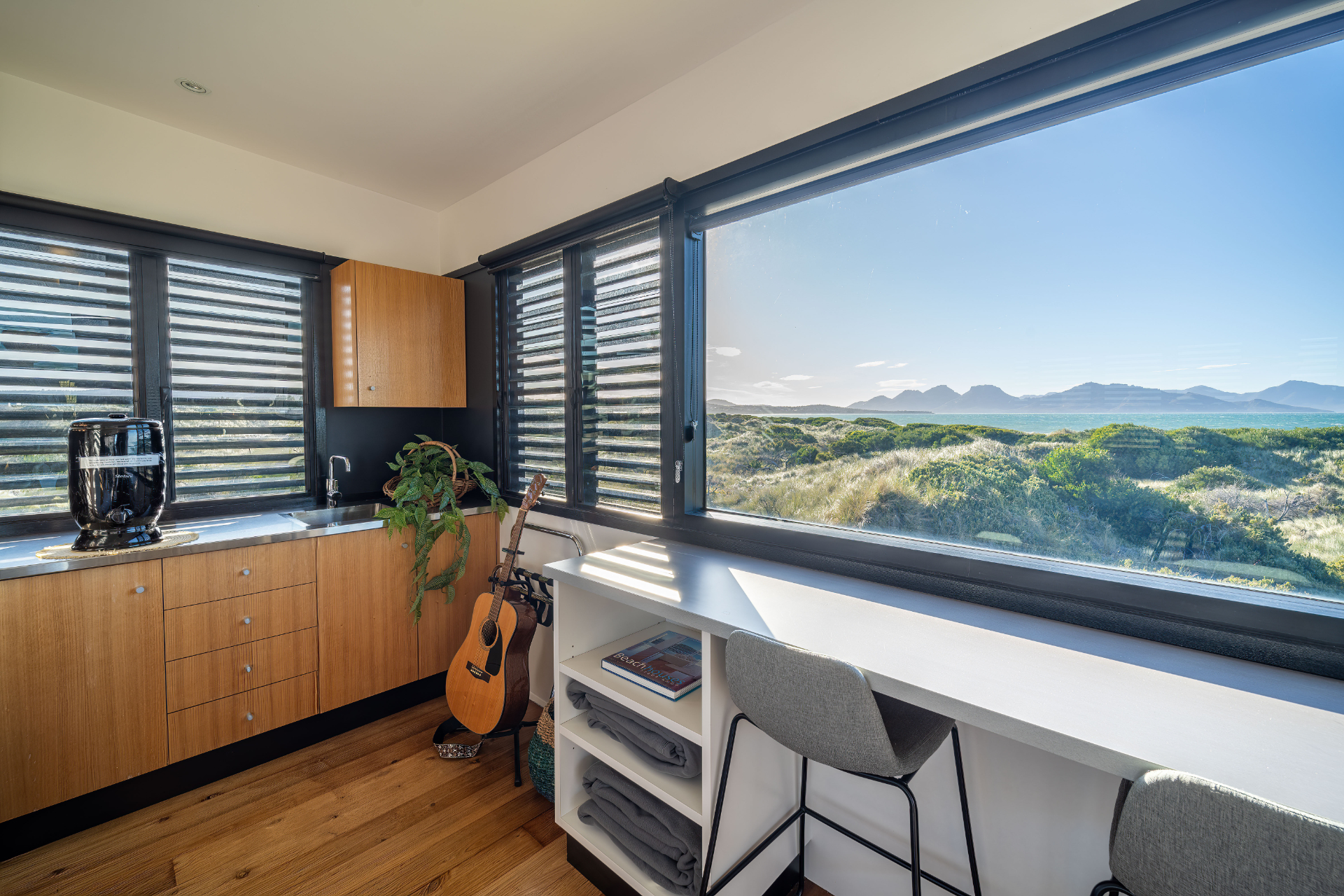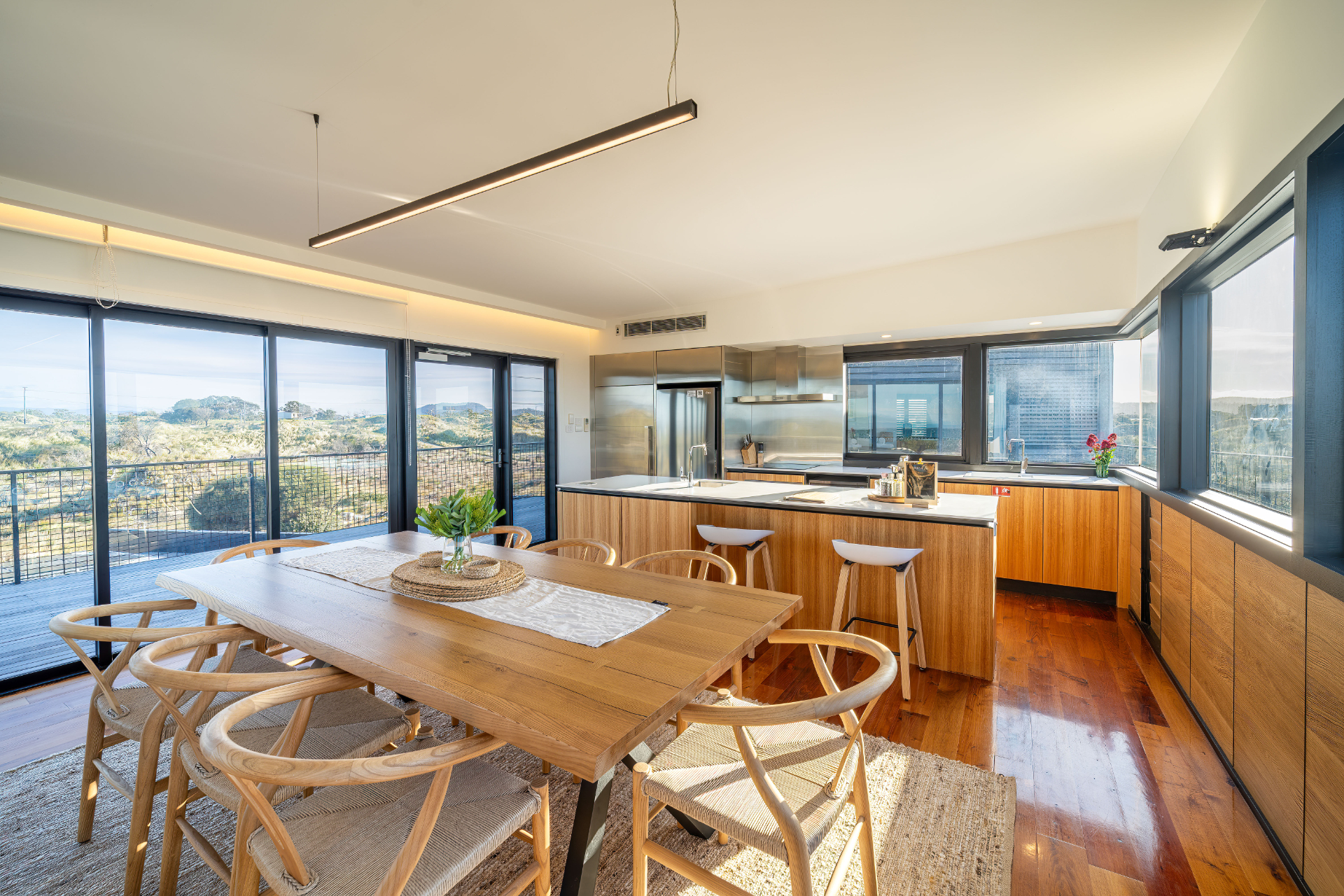 The house has been mindfully designed to sit peacefully amongst this scenic landscape. The interior has crisp, clean lines, continuously drawing your eyes out to the stunning views.