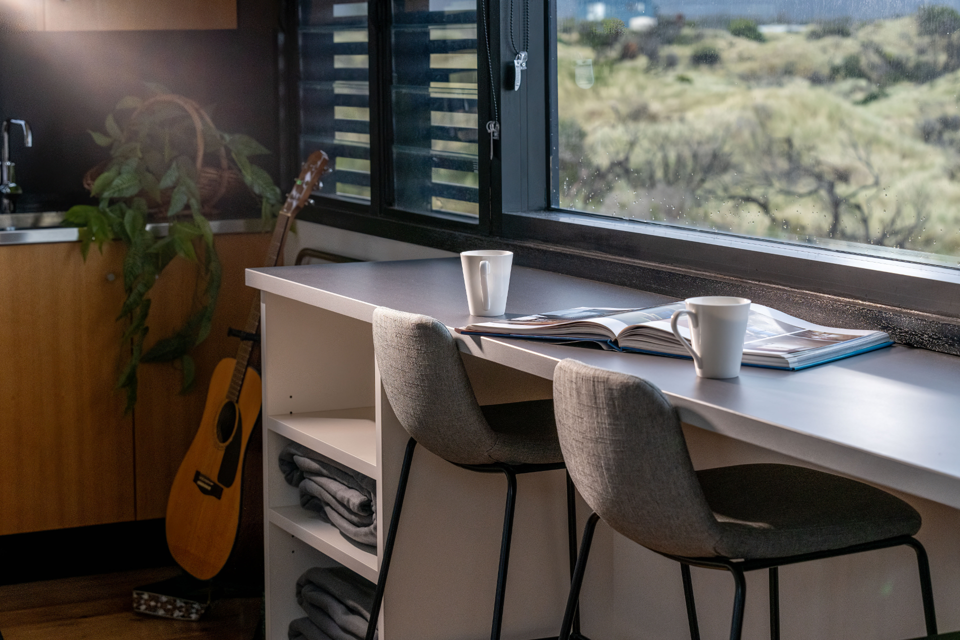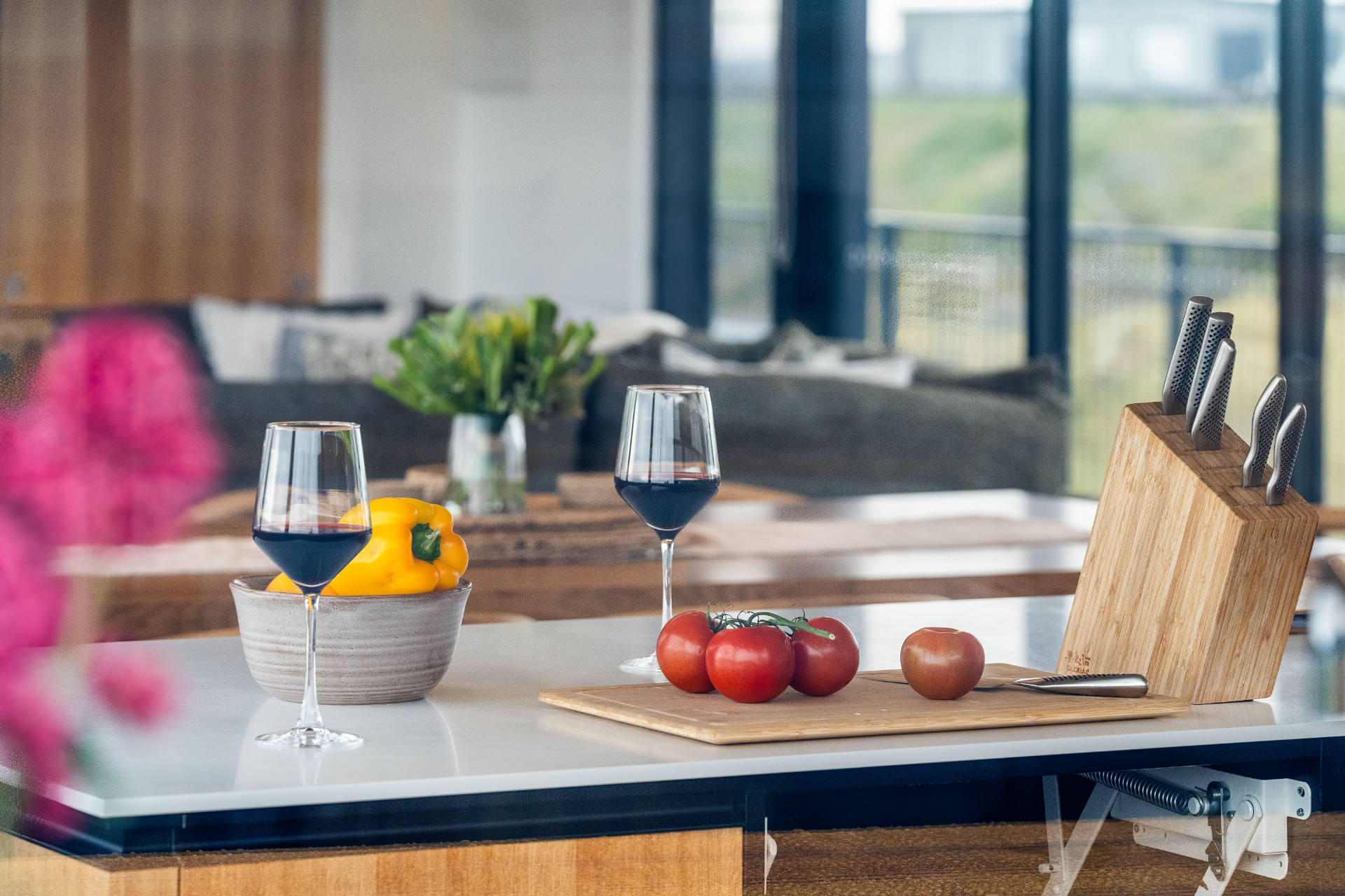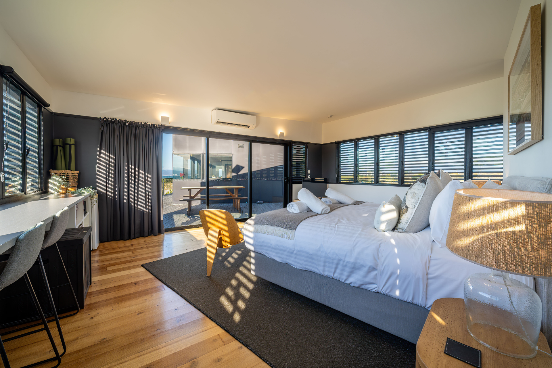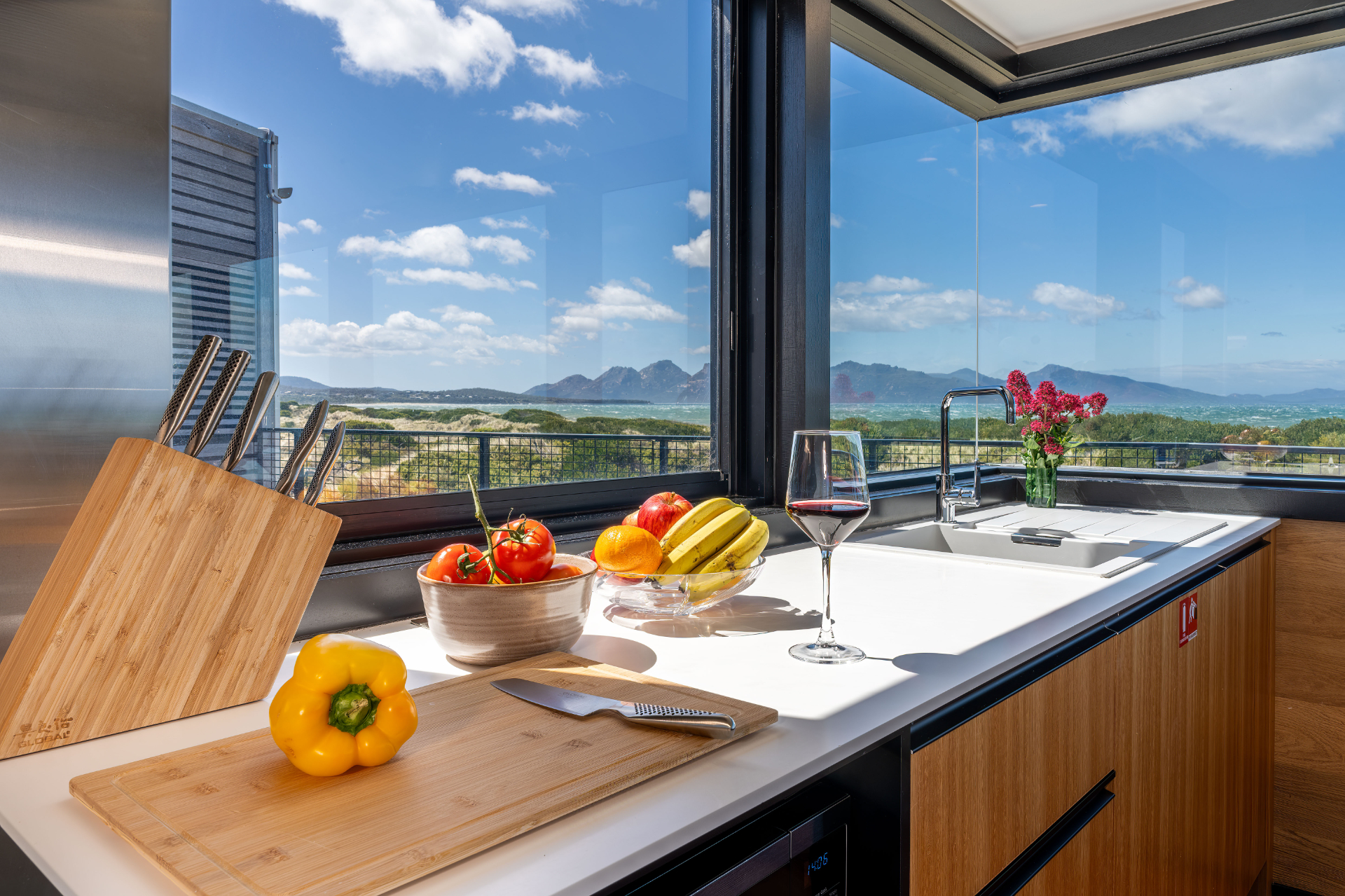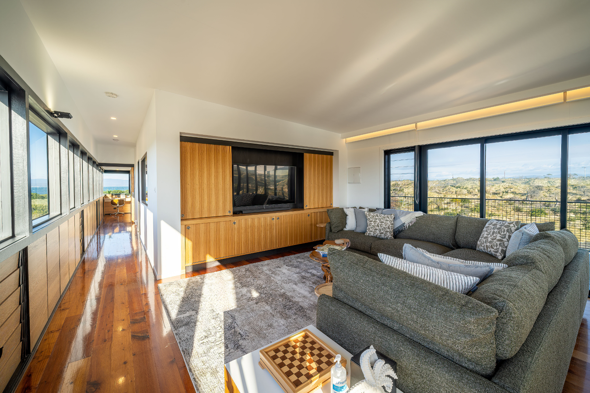 The house has been mindfully designed to sit peacefully amongst this scenic landscape. The interior has crisp, clean lines, continuously drawing your eyes out to the stunning views.